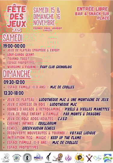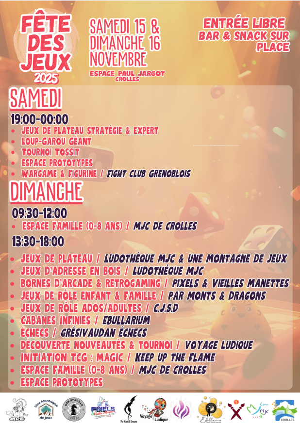 Une nouvelle formule, car la fête des jeux de la ville de Crolles débutera dès le samedi par une soirée spéciale pour les ados et les adultes, suivi d’une mâtiné le dimanche réservée aux plus jeunes, avant d’enchaîner avec la traditionnelle après-midi festive ouverte à toutes et à tous où vous pourrez nous retrouver.